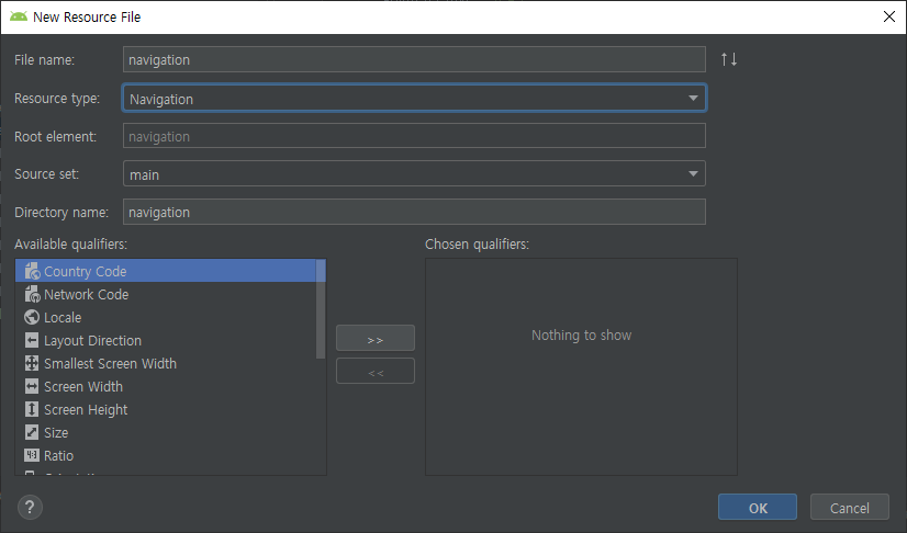 아래와 같이 File name "navigation", Resource type "Navigation" 을 선택해 줍니다. 그리고 OK를 눌러줍니다.