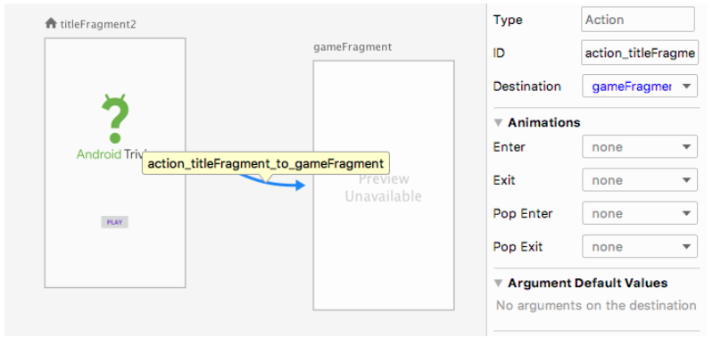 titleFragment에서 gameFragment로 드래그하여 두 프래그먼트 사이에 action을 만들어 줍니다. action의 ID가 action_titleFragment_to_gameFragment로 설정 되었는지 확인합니다.