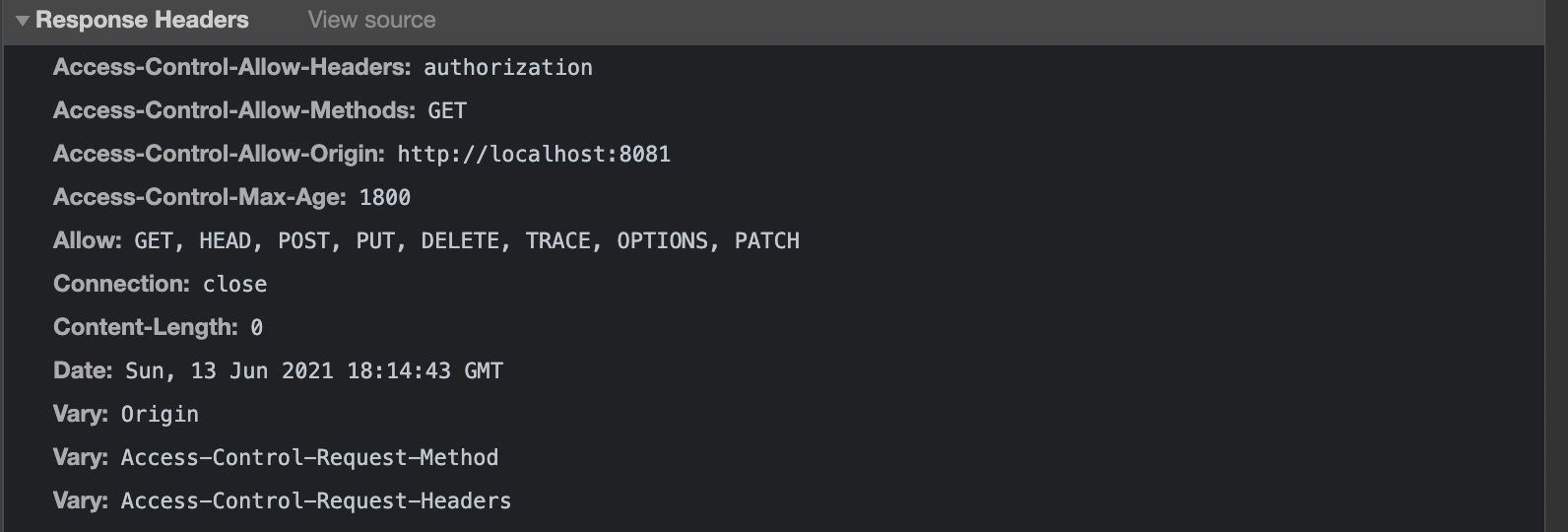 해당 요청에 대한 응답을 Access-Control-Allow-Origin에 프론트 엔드 애플리케이션 origin이 허락되어 있고, 모든 메소드(GET, HEAD, POST, PUT...)에 대한 허락도 되어있다.