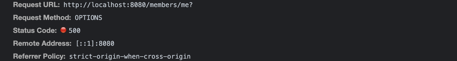 서버에서는 member/me로 들어온 요청에 대해 토큰 검사를 하고 있다. 그러나 member/me preflight의 authorization에는 토큰이 들어 있지 않다. 서버에서 모든 origin에 대해 허가를 해뒀음으로 preflight요청에 대한 응답헤더는 정상적으로 작성이 되었으나 intercepter에서 토큰을 처리하다가 500에러를 발생시키므로 응답 StatusCode로 500이 들어가게 되었다. 그래서 브라우저는 이를 CORS에러로 판단한 것이다.