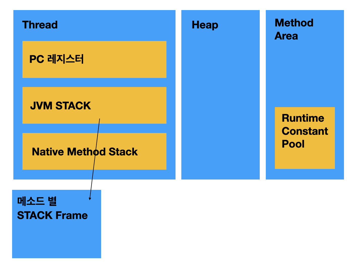 - 메소드 별 Stack Frame에는 메소드 안에 정의된 로컬변수, 매개변수, 리턴 값 등이 저장된다.