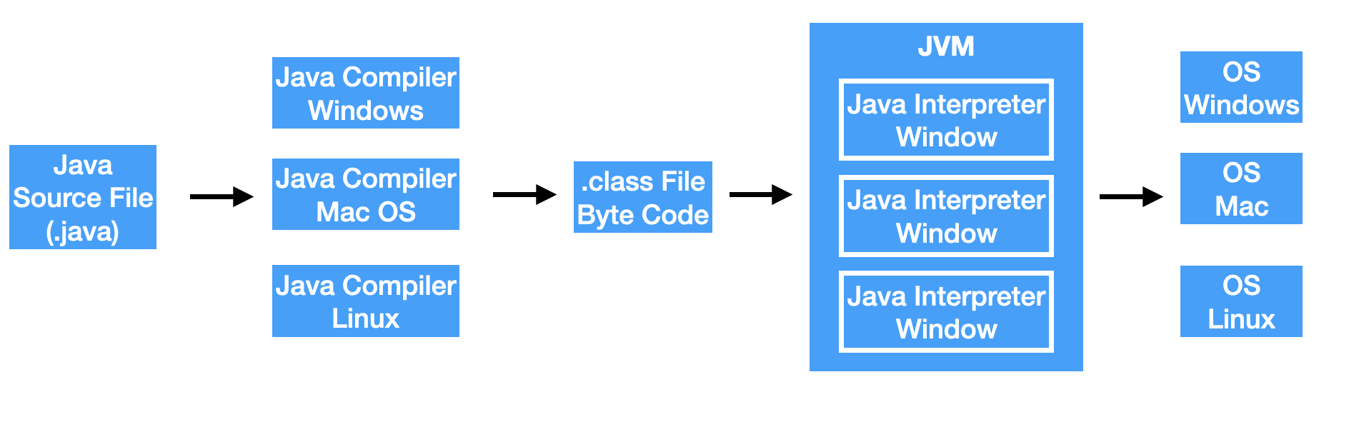 - Java Compiler를 통해 Hello.class파일이 생성된다. Byte Code는 플랫폼 독립적이다. OS관계 없이 동일하다. (javac 명령어)
