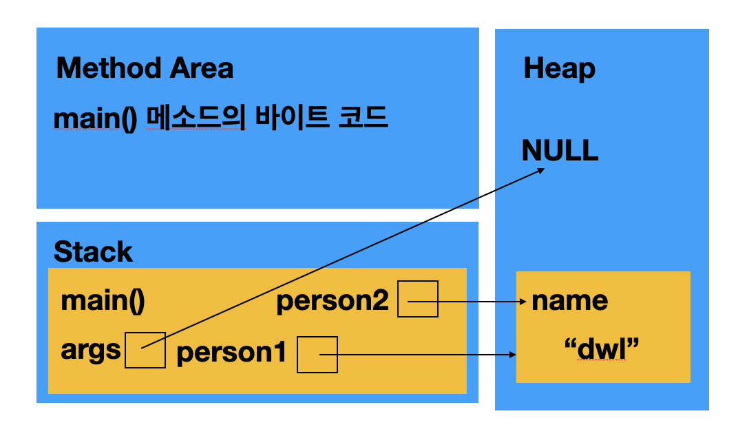 - 메소드 내에서 객체 참조 형으로 선언된 변수인 경우 지역변수로서 스택에 위치하며 힙에 저장되어 있는 객체애 대한 참조값을 가지게 된다.