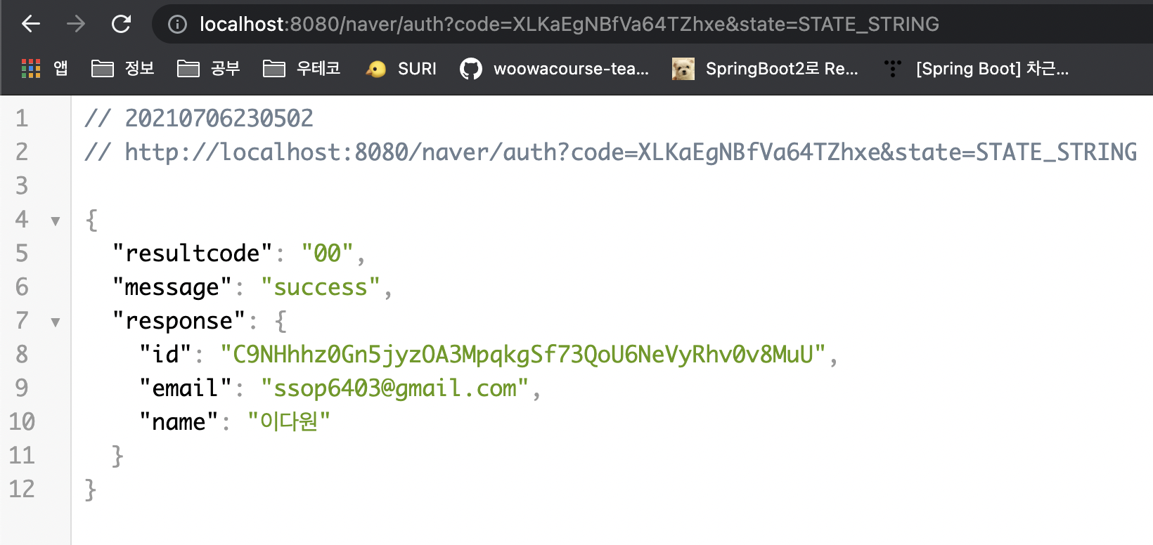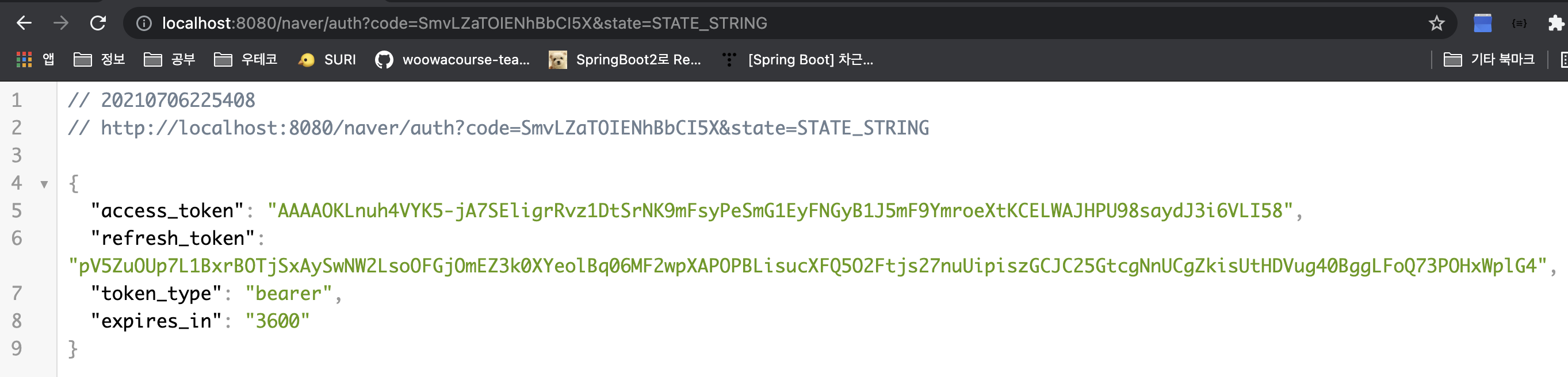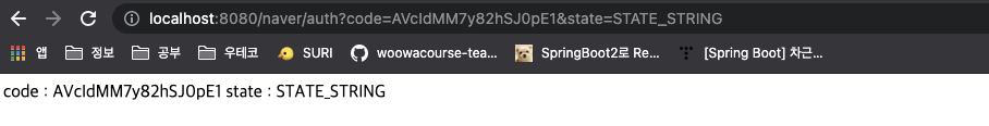 인가코드를 얻는데 성공하였다. 네이버는 AccessToken을 얻기 위해 state값도 필요하므로 저장해둔다.