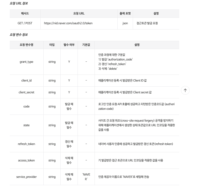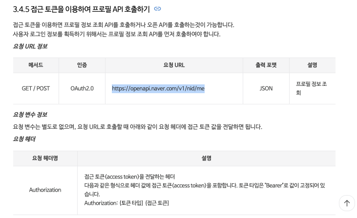 위의 Callback으로 전달받은 정보를 이용하여 접근 토큰을 발급받을 수 있다. 접근 토큰은 사용자가 인증을 완료했다는 것을 보장할 수 있는 인증 정보이다. 이 접근 토큰을 이용하여 프로필 API를 호출하거나 오픈 API를 호출하는것이 가능하다.
