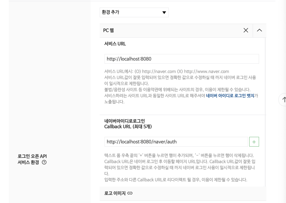 서비스 URL과 네이버아이디로그인 Callback URL을 설정해 준다. 애플리케이션의 API 설정에서 설정 가능하다.