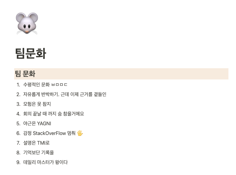 위의 사진에서 보이는 팀 문화외에 따로 팀 규칙을 몇가지 정했다.