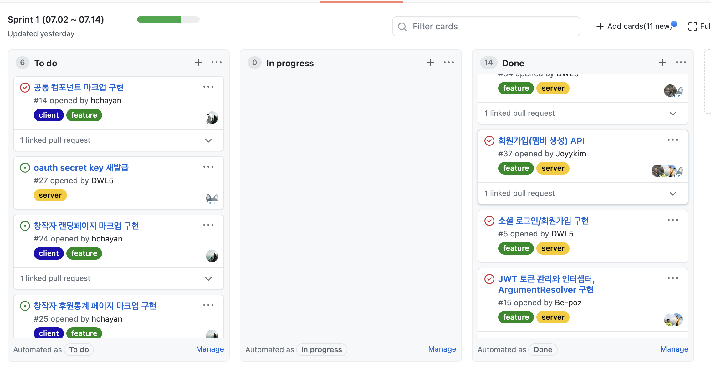 - 깃헙에서 이슈를 관리하도록 하였다.