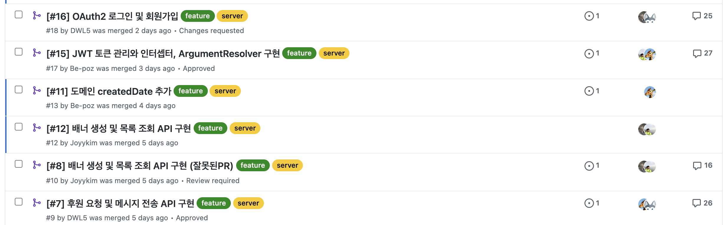 그리고 서로의 pr을 코드리뷰 하고 반영이 되면 merge를 한다!