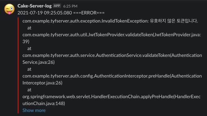 Logger와 Slack의 incoming-webhook을 사용하여 서버에서 에러가 발생했을 때 Slack으로 알림을 받도록 설정하였다.