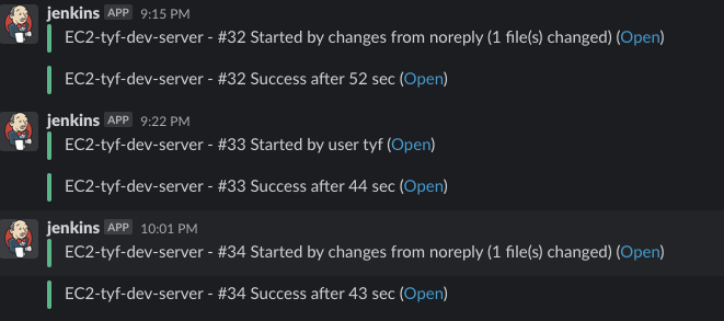 또한 젠킨스 구동 시 상태를 슬랙으로 전달 받을 수 있도록 설정하였다.
