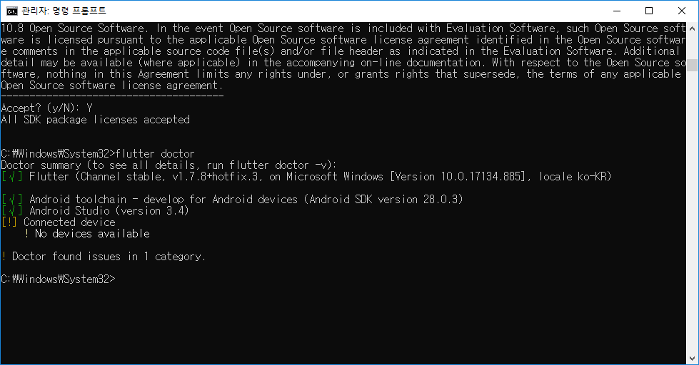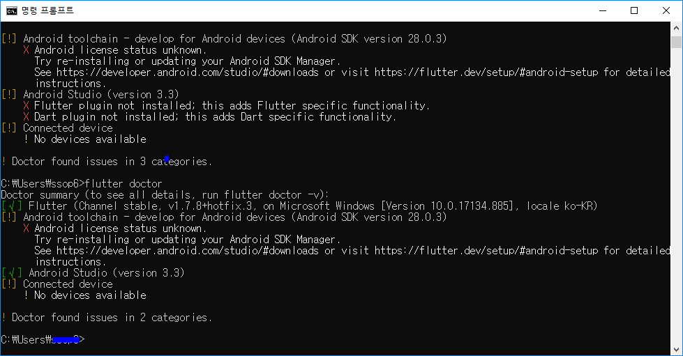 Flutter 플러그인이 설치가 완료되었다면, cmd창에 "flutter doctor"명령어를 통해 제대로 설치가 완료되었는지 확인해 볼 수 있습니다.