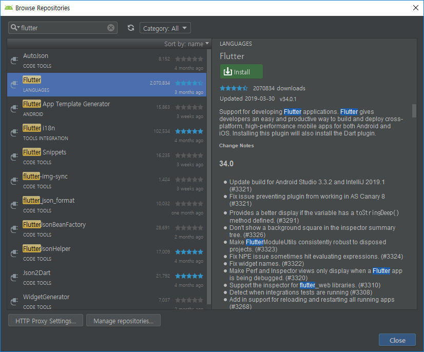 플러그인 창이 뜨면 하단의 "Browser repositories"를 클릭 후 검색 창에 Flutter를 검색해 줍니다. Flutter 선택 후 오른쪽의 초록색 버튼 "install"을 클릭해 줍니다. 설치가 완료 되면 초록색 버튼이 "Restart Android Studio"로 바뀌는데 눌러주어 안드로이드 스튜디오를 재시작 해줍니다.