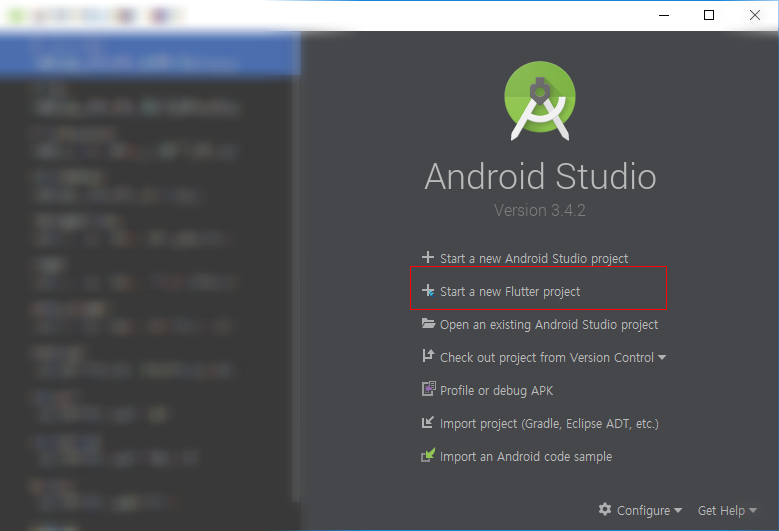 위의 절차를 다 마치시고 안드로이드 스튜디오를 재시작 하시면 아래와 같이 Start new Flutter Project가 생긴 것을 보실 수 있습니다.