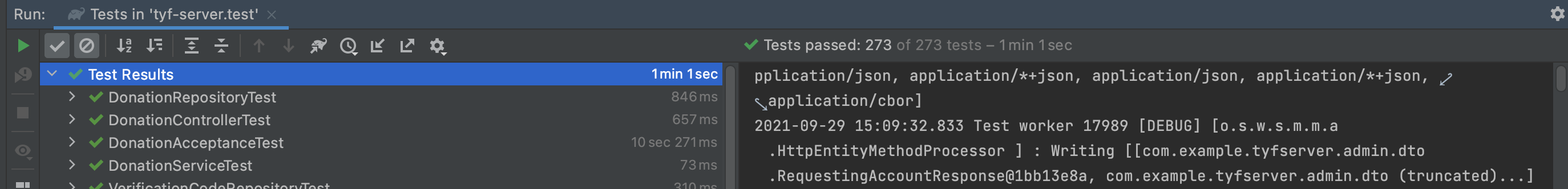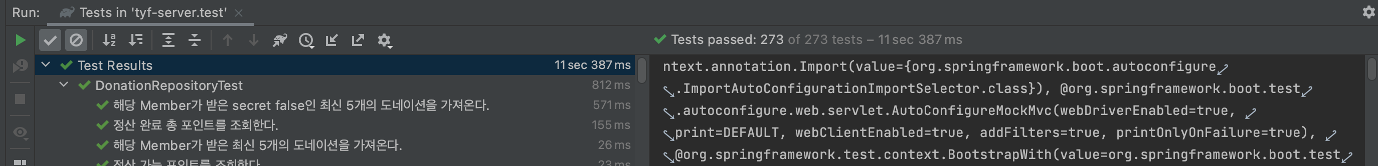 - @DirtiesContext제거 하고, 인수테스트 수행 하기 전 DB를 초기화 하도록 변경하니 11sec 387ms로 테스트 수행시간이 현저히 감소했다!