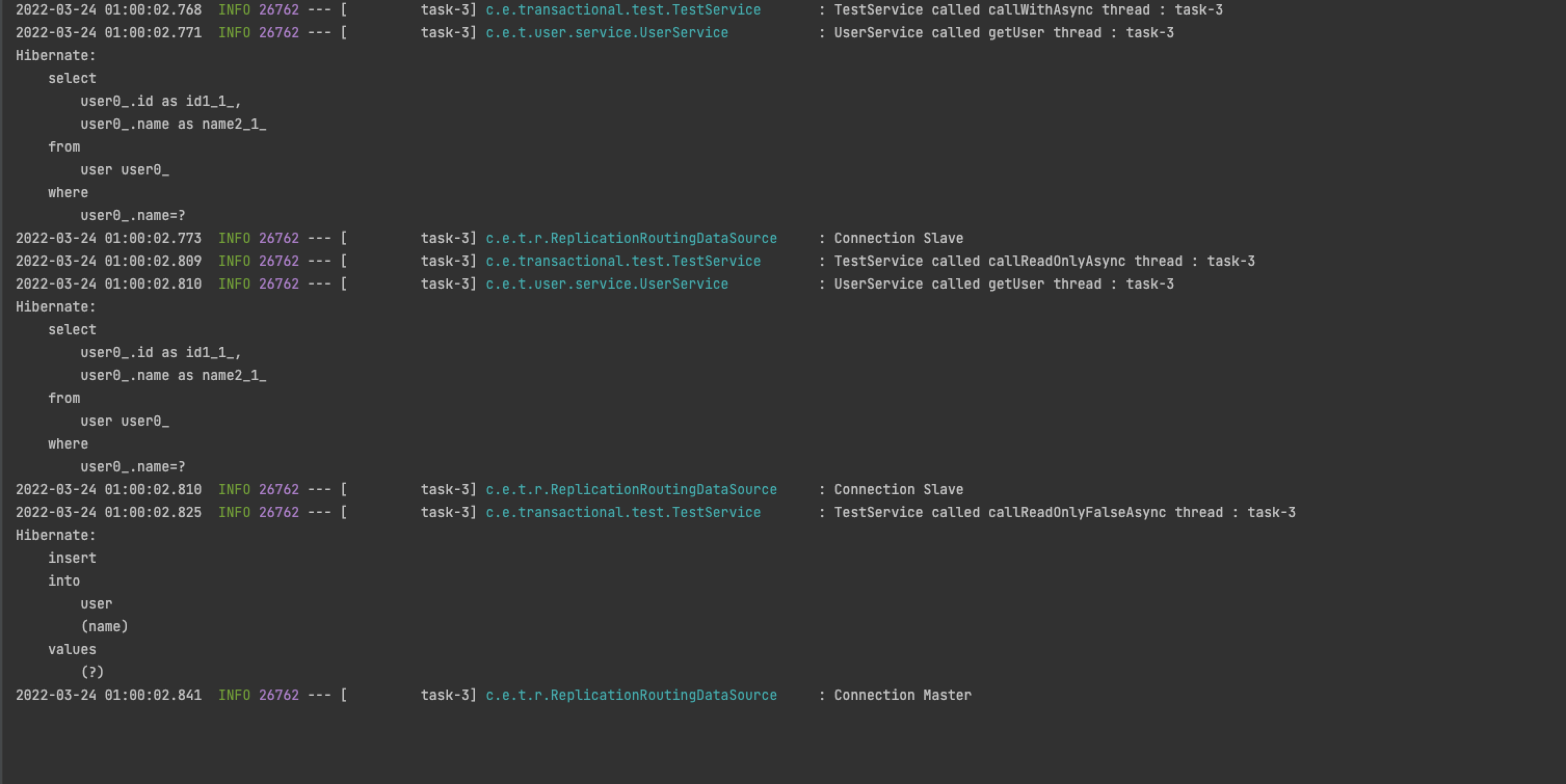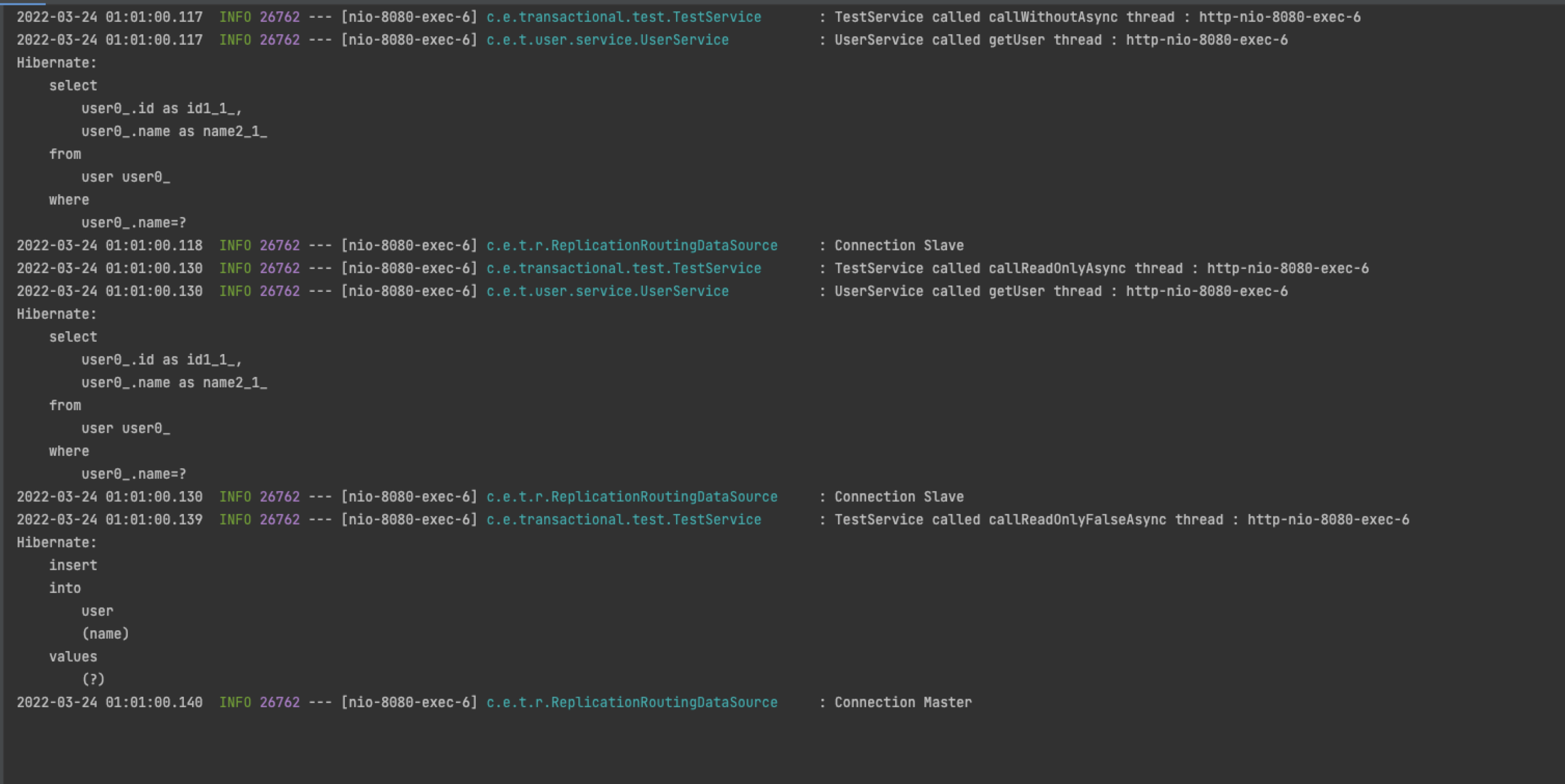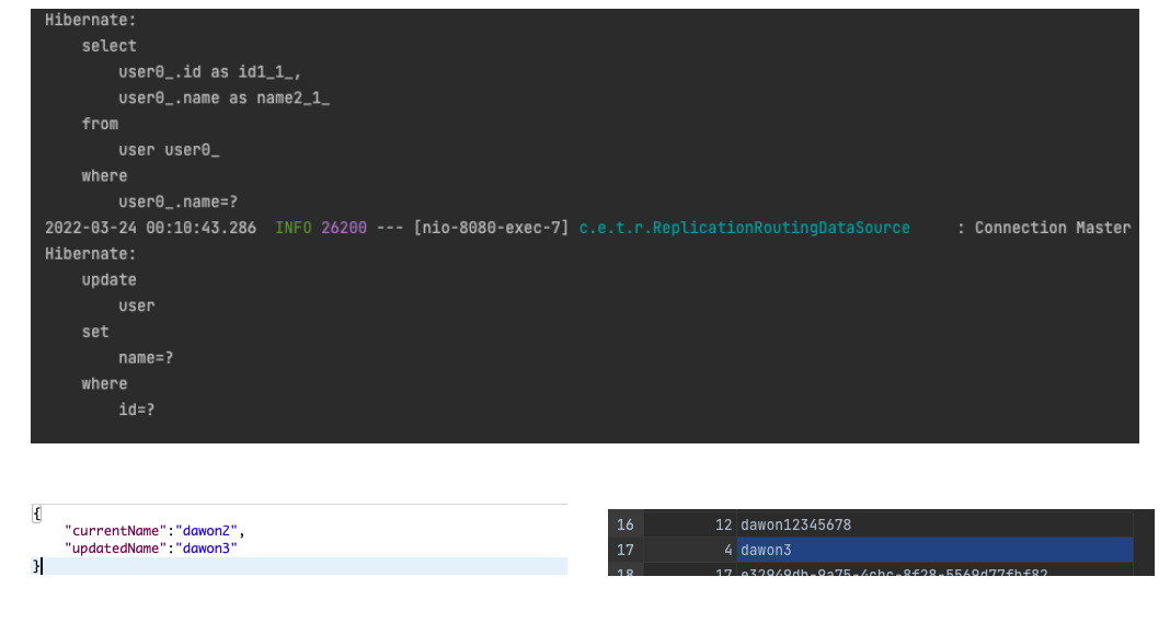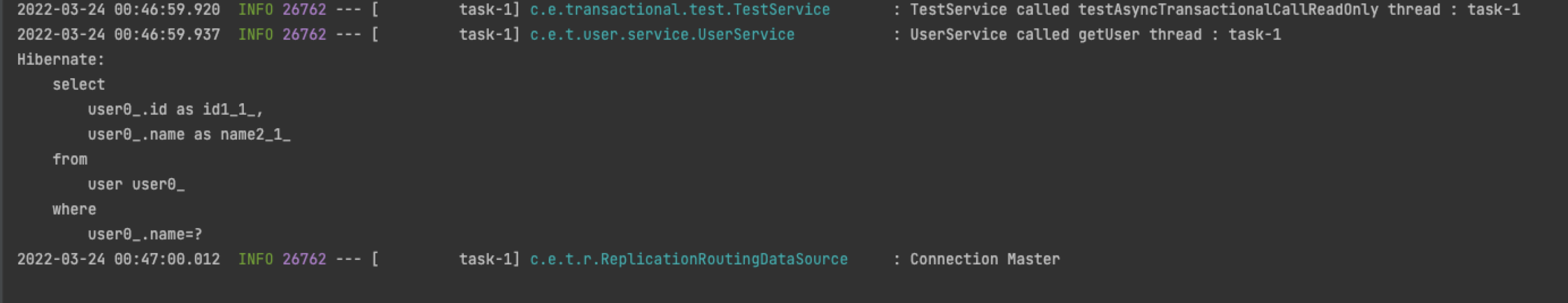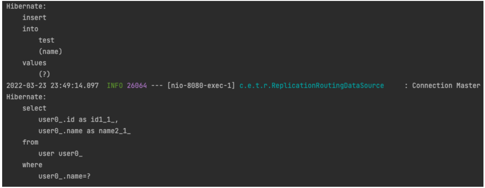 - 해당 쓰레드에서 가져온 커넥션 (Read-Only False 이기 때문에 Master)로 Read-Only True 메소드인 getUser()가 실행되었다.