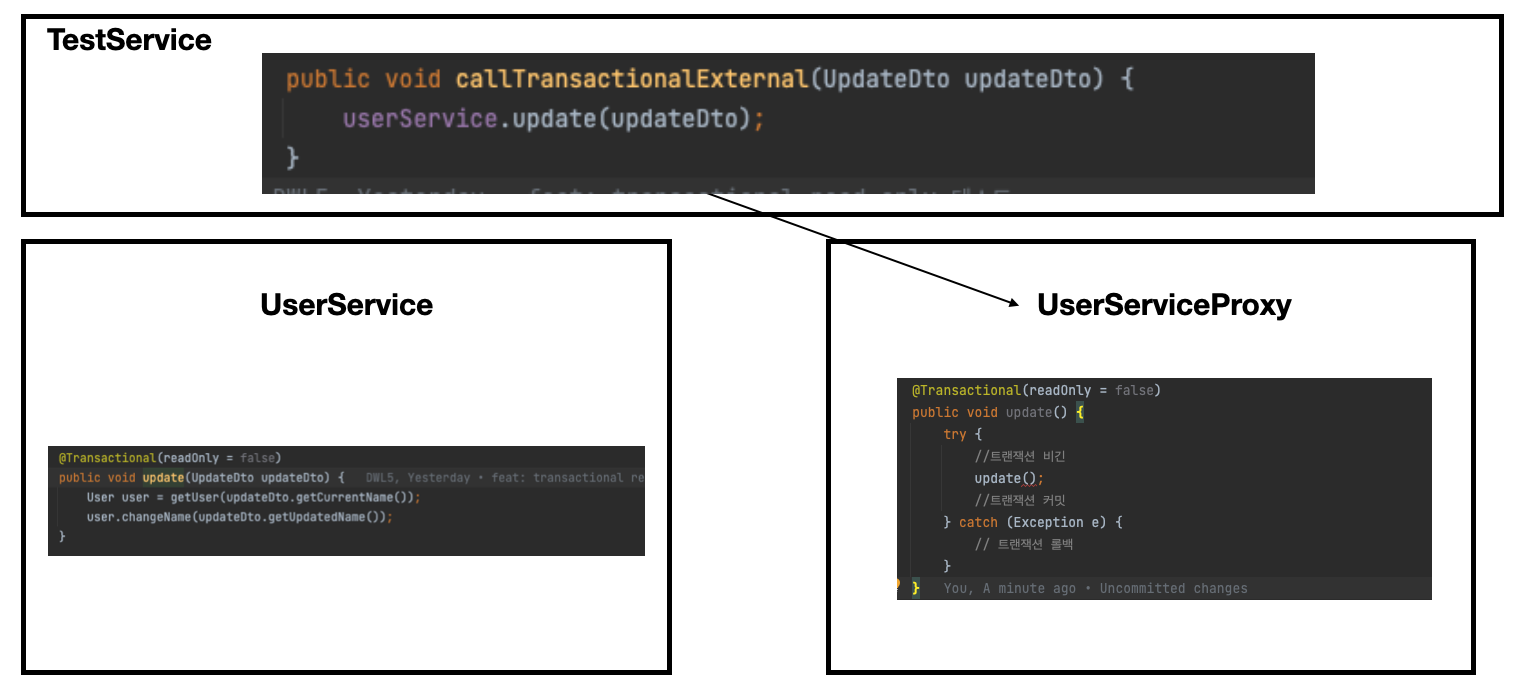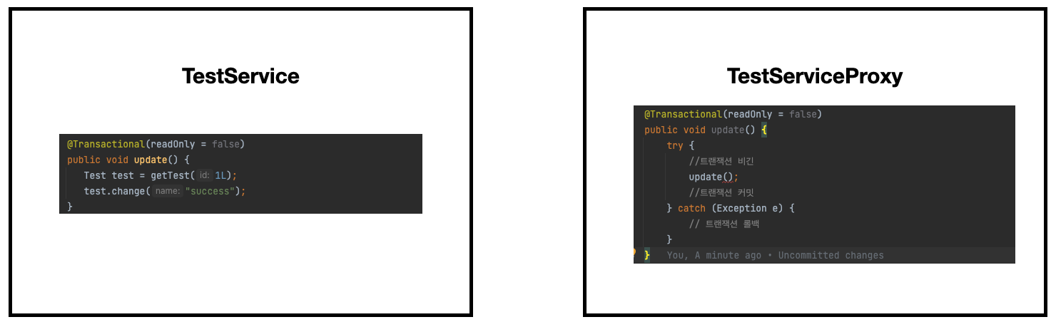 - 프록시 객체의 update에서 트랜잭션 비긴, 커밋, 롤백과 같은 작업이 이루어진다.