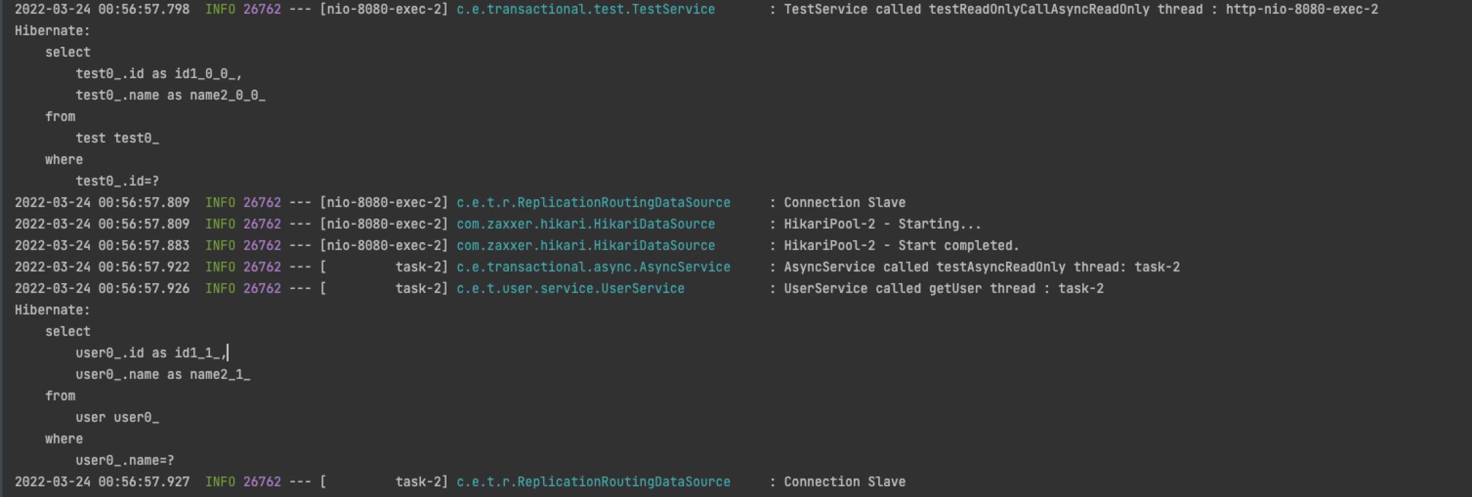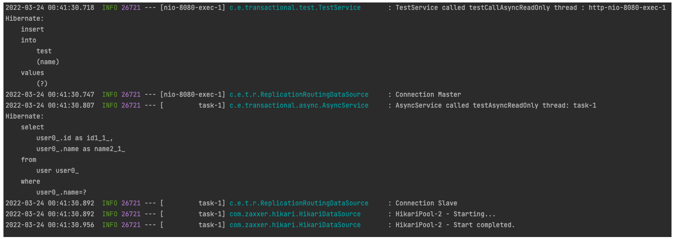 - 그리고 각 쓰레드마다 커넥션이 새로 생성되었으며 Transactional Read-Only 설정에 따라 Master, Slave로 연결이 되었다.