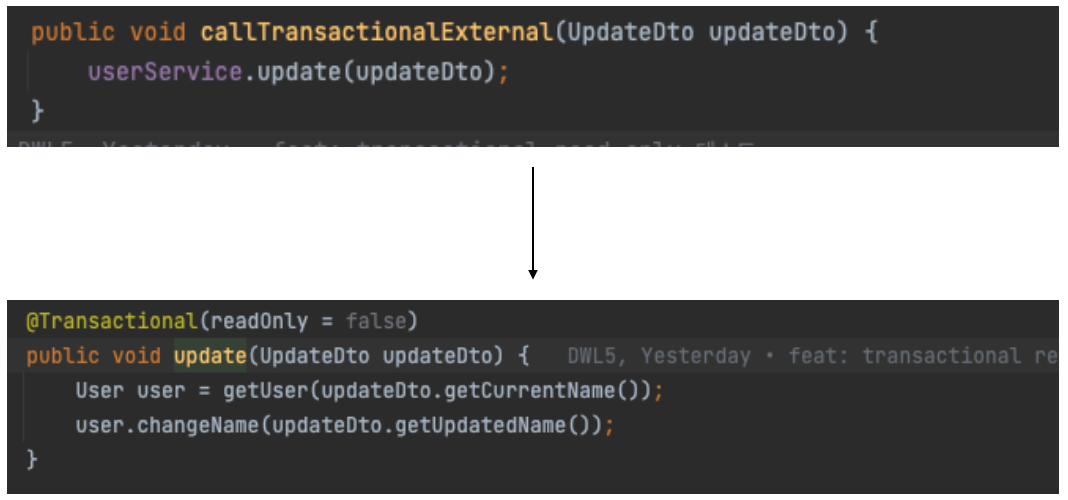 @Transactional이 없는 메소드에서 외부 @Transactional이 붙은 메서드를 실행