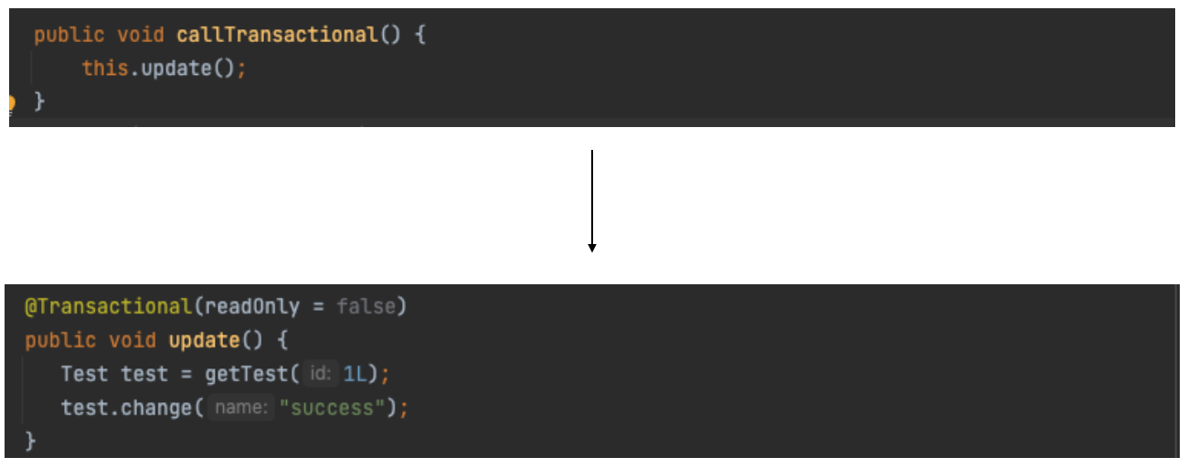 @Transactional이 없는 메소드에서 자신의 @Transactional이 붙은 메서드를 실행