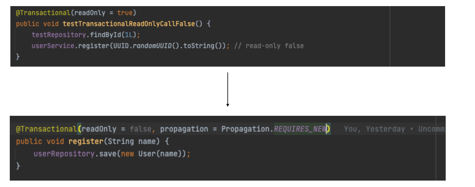 Transactional Read-Only False 메소드 안에서 Read-Only True인 메소드가 실행된다면?