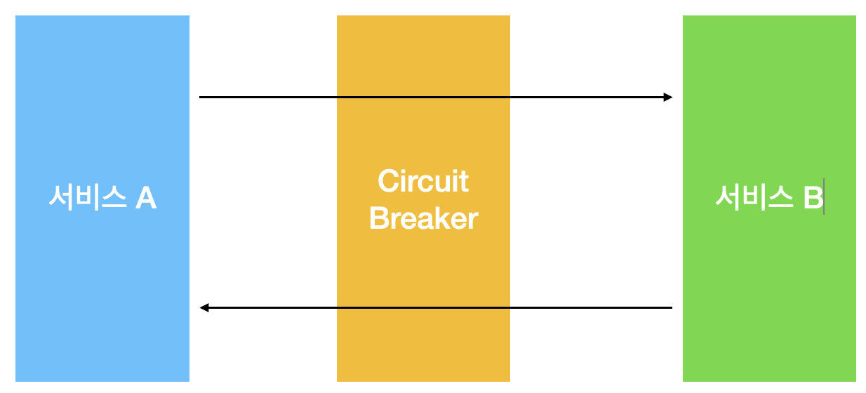 서킷브레이커 패턴은 서비스 A와 서비스 B사이에 서킷브레이커를 두어 서비스 B로 전달되는 요청이 서킷브레이커를 통해 전달되도록 하는 패턴 입니다.