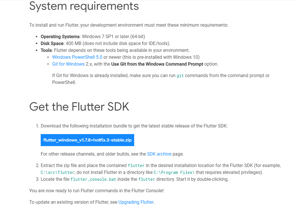 아래와 같은 화면에서 "Get the Flutter SDK" 섹션에 있는 zip파일을 다운받아 줍니다. 다운받은 zip파일을 적당한 경로에 풀어줍니다.