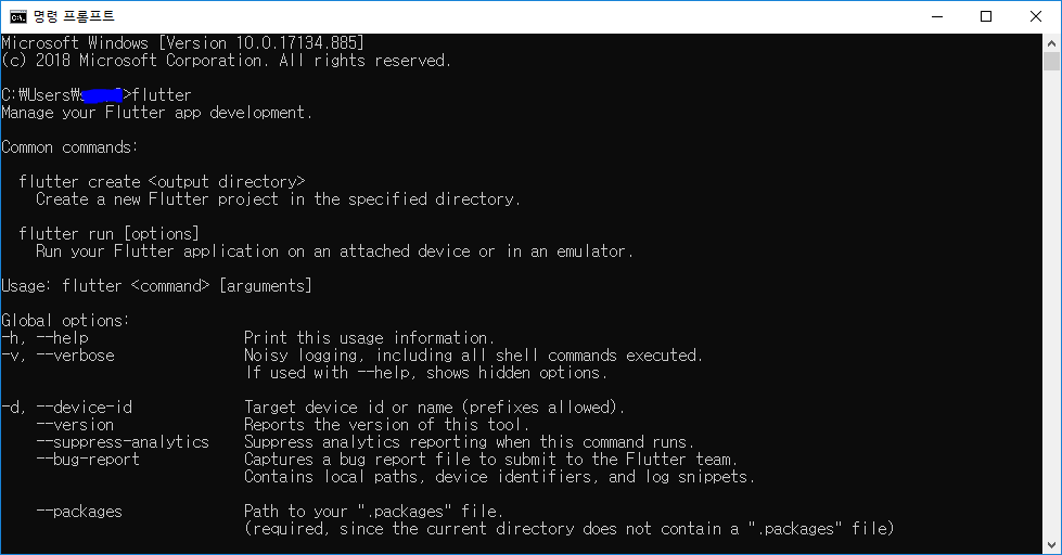 위의 단계 까지 마치셨다면 환경변수 등록이 완료 되었습니다. 확인은 cmd창을 켜서 flutter라고 입력 시 아래와 같이 명령어를 인식한다면 성공입니다!
