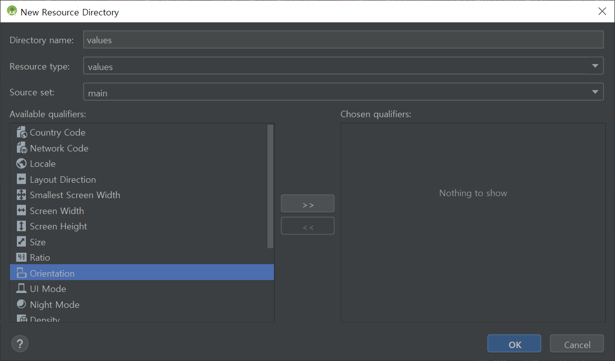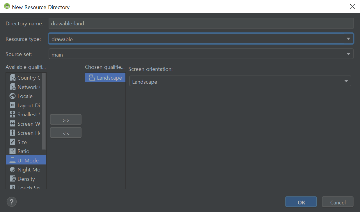 Available Qualifiers에서 "Orientation"을 선택한 뒤, ">>" 버튼을 눌러줍니다. 그리고 Resource type을 drawable로 바꾸어 줍니다. 이 예제에서는 이미지 노출 여부를 화면전화에 따라 결정 할 것이기 때문입니다. 그 다음 Screen orientation을 Landscape와 portarit 둘 다 만들어 줍니다.