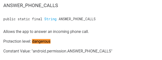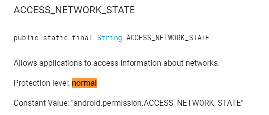 안드로이드 문서에는 아래와 같이 권한들이 정의되어 있는데 어떤 권한은 Protection level이 normal 어떤 것은 dangerous로 정의 되어있는 것을 확인 할 수 있습니다. dangerous는 앱이 사용자의 개인 정보를 포함하거나 이용자의 저장된 데이터나 다른 앱의 작업에 영햐을 미칠 수 있는 데이터나 리소르를 필요로 하는 권한을 말합니다.
