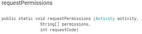 앱에 필요한 권한이 아직 없다면 requestPermissions()를 사용해서 적절한 권한을 요청해야 합니다. requestPermission()의 정의는 아래와 같이 되어 있습니다. 사용자가 권한 요청 메시지에 응답하면 시스템은 그 결과를 가지고 앱의 콜백 메서드 (onRequestPermissionResult)를 호출합니다. 이 때 requestPermissions에 보냈던 requsetCode가 전달 됩니다.