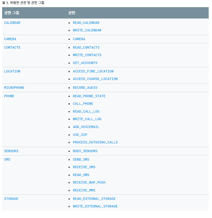 // 시스템이 표시하는 메시지는 특정 권한이 아닌 앱이 액세스 해야하는 권한 그룹을 설명