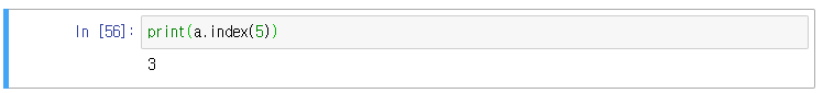 index()를 사용하여 해당 값의 인덱스를 얻어 올 수 있다. 아래 코드로 5의 인덱스는 현재 a배열에서 3이라는 것을 확인 할 수 있다.