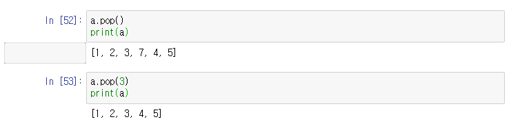 pop()을 사용하여 리스트에서 맨 마지막 값을 빼낼 수 있으며, 인덱스를 인자로 주어 해당 인덱스의 값을 빼낼 수도 있다.