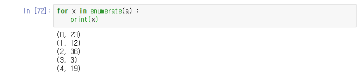 enumerate()를 사용하면 인덱스,값 형태의 튜플로 접근 할 수 있다.