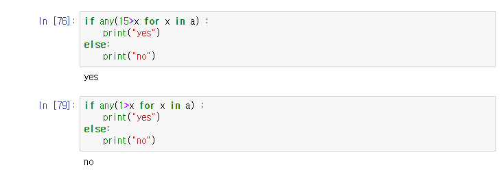 any는 해당 for문의 값이 주어진 조건 하나라도 만족한다면 true를 리턴한다. 모두 만족 하지 않으면 false를 리턴 한다.